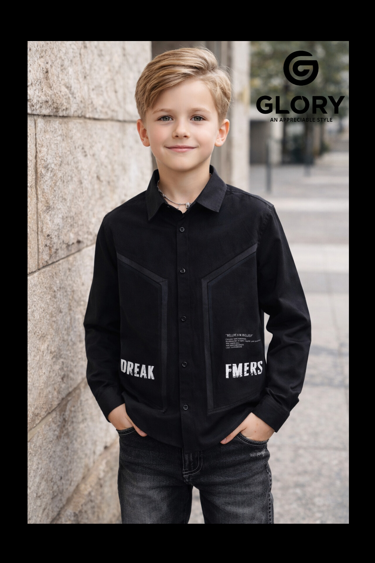 Give your child a bold and modern look with this boys black casual shirt, designed with sleek contrast line detailing and subtle text accents. The classic black color adds a premium street-style vibe, making it a perfect choice for fashion-forward kids.