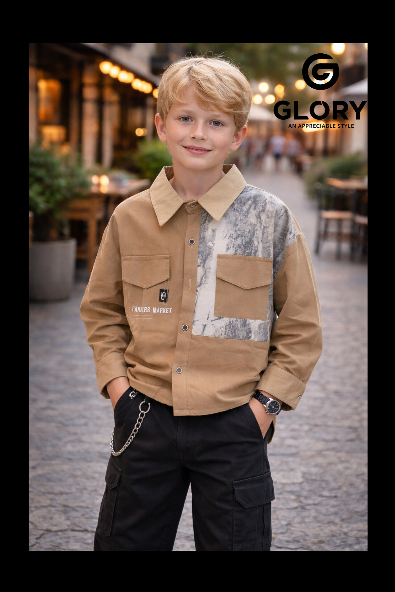 Upgrade your kid’s casual wardrobe with this trendy boys camel brown color block shirt, designed with a modern printed panel for a stylish streetwear look. The smart combination of solid fabric and textured print detailing makes this shirt stand out while keeping it comfortable for everyday wear.
