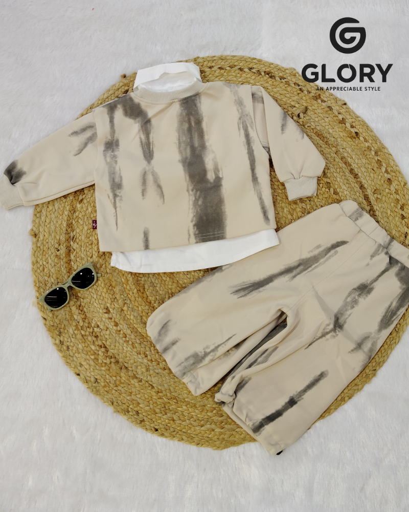 The sweatshirt comes with an elegant printed text design on the front, giving a classy yet modern look. The elastic-waist pants ensure a relaxed and flexible fit, making this set perfect for daily wear, outings, travel, or casual events. The neutral beige tone with subtle tie-dye accents adds a premium and trendy finish.