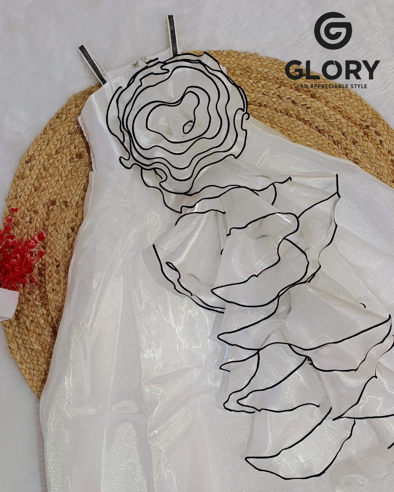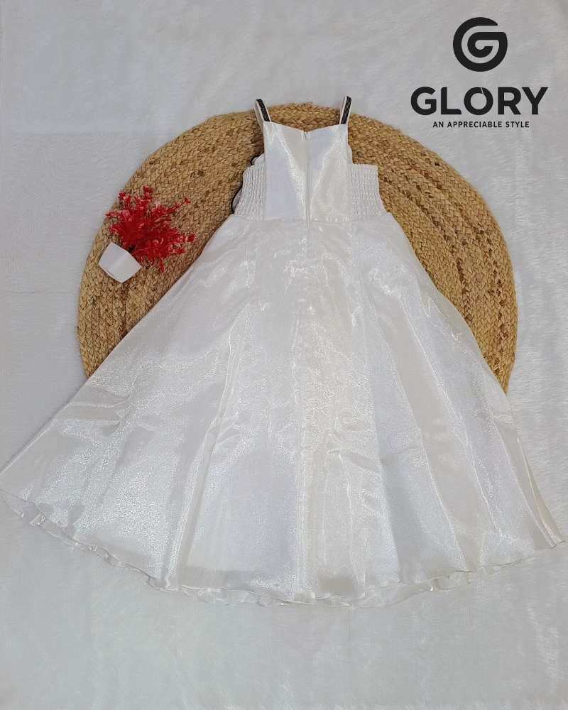 This white party gown is a stylish and elegant choice for your little girl. It comes with thin shoulder straps and a soft shimmer fabric that looks beautiful from every angle. The gown features a unique petal-style design on the front, outlined with black detailing that makes it stand out.