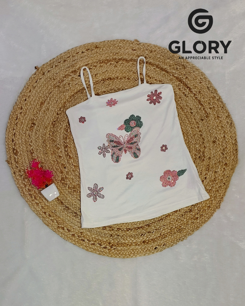 Elegant White Women’s Spaghetti Top with Butterfly Stone Work – Soft Stretch Fabric & Trendy Party-Casual Style