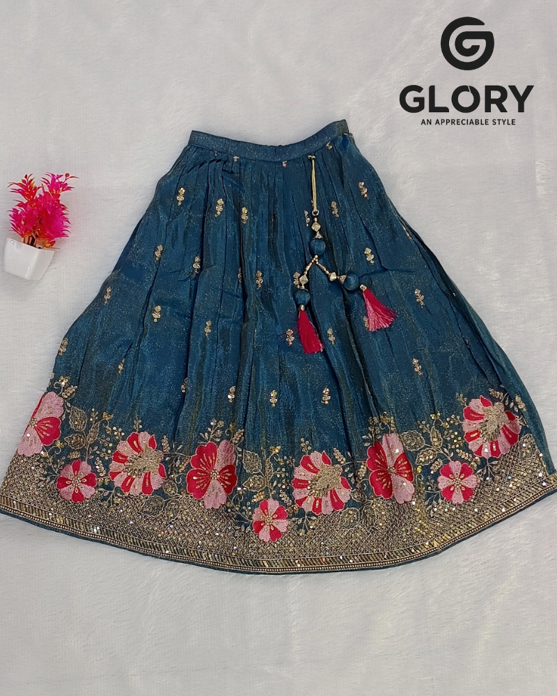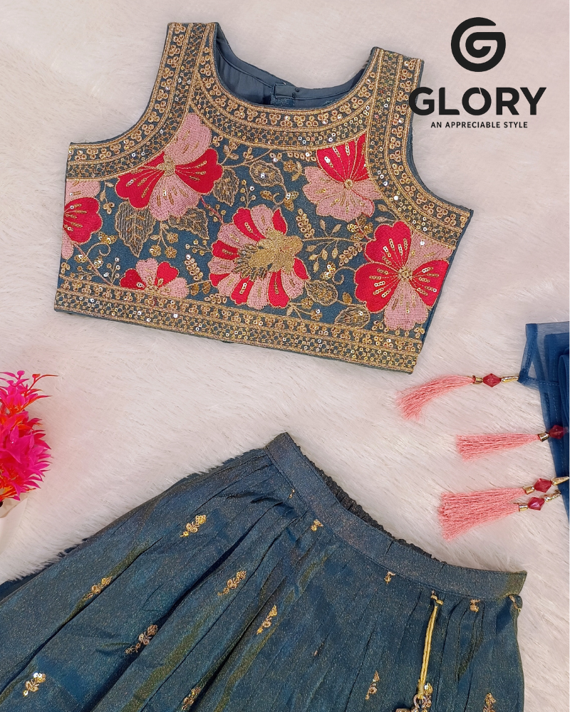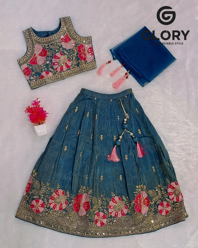 Dress your little princess in pure festive elegance with this stunning Girls Teal Embroidered Lehenga Choli Set. The beautifully crafted sleeveless choli comes with intricate floral embroidery in shades of pink, gold, and green, highlighted with delicate mirror and thread work that adds a luxurious shine to the outfit.