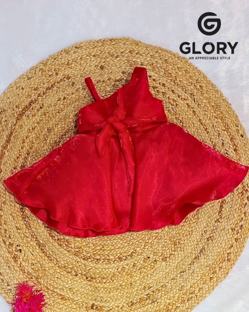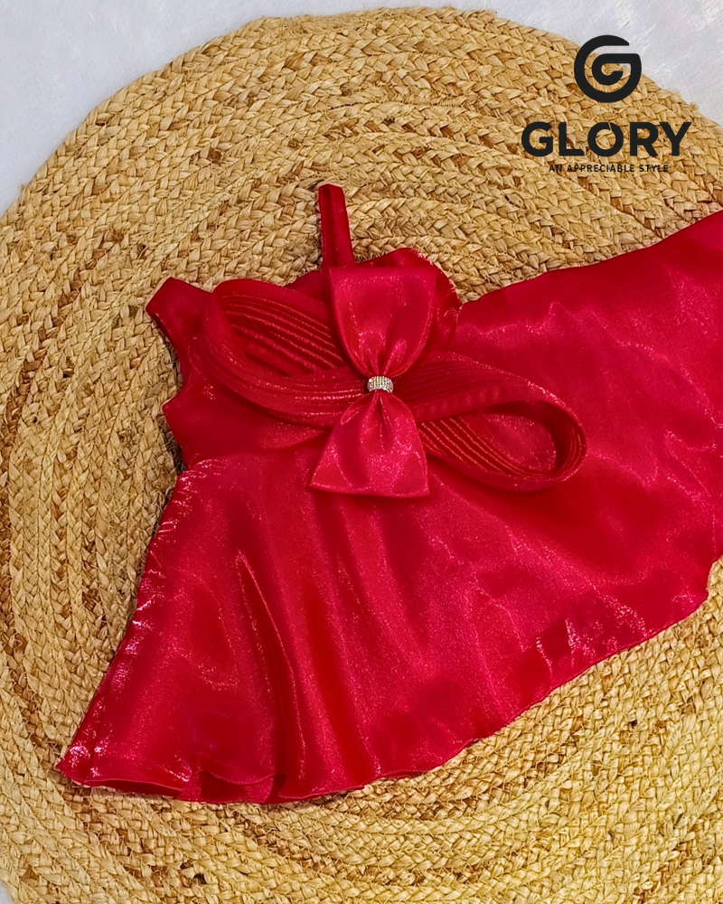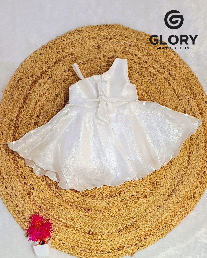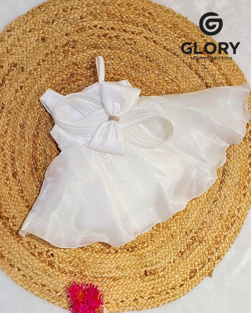 This elegant white party wear frock is designed to give your little princess a classy and angelic look. The dress features a beautiful front bow with a golden embellishment in the center, adding a touch of shine and charm.