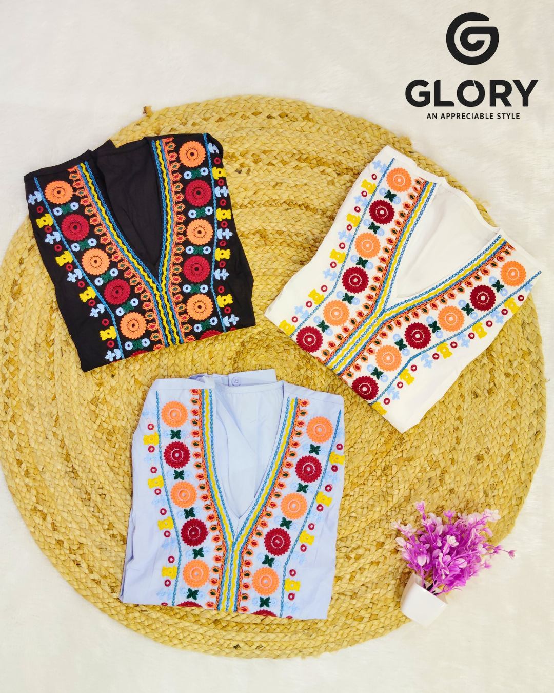 Elevate your everyday style with this stunning embroidered womenโs top, designed with full sleeves and a stylish V-neckline. The delicate embroidery adds a touch of grace, making it perfect for both casual and festive outings.