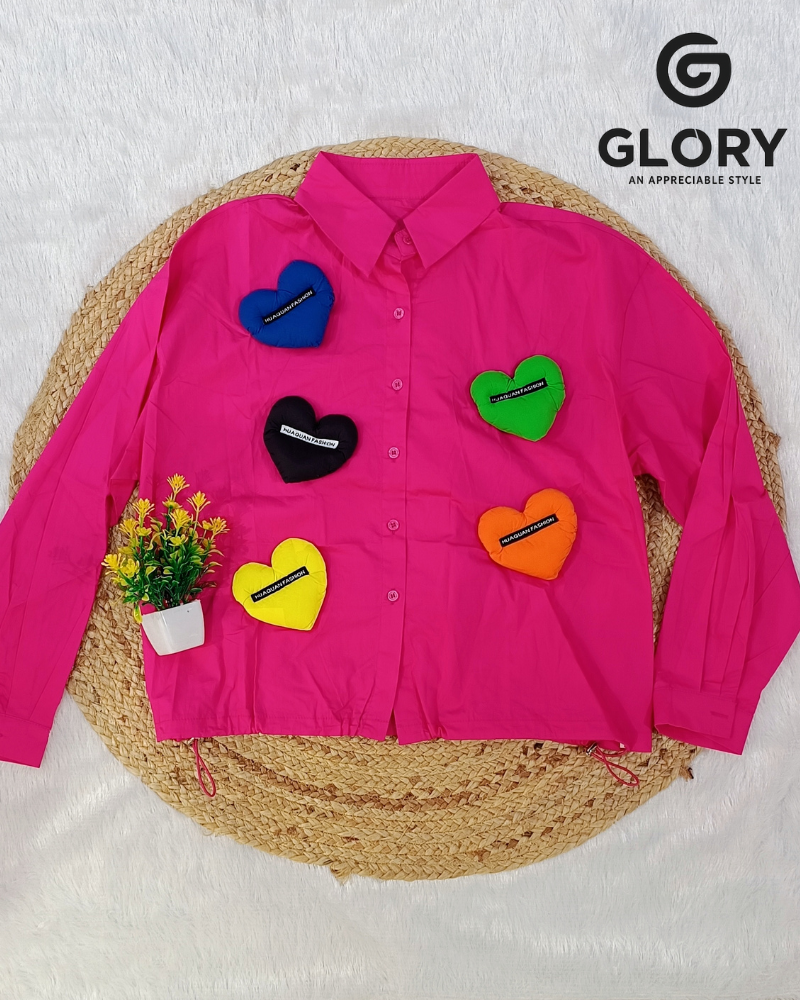 Make your style stand out with this trendy pink oversized crop shirt, decorated with cute and colorful heart patches. Its relaxed fit and soft fabric give you ultimate comfort, while the playful design adds a fun, youthful vibe to your look. Perfect for casual outings, college wear, or stylish everyday fashion.