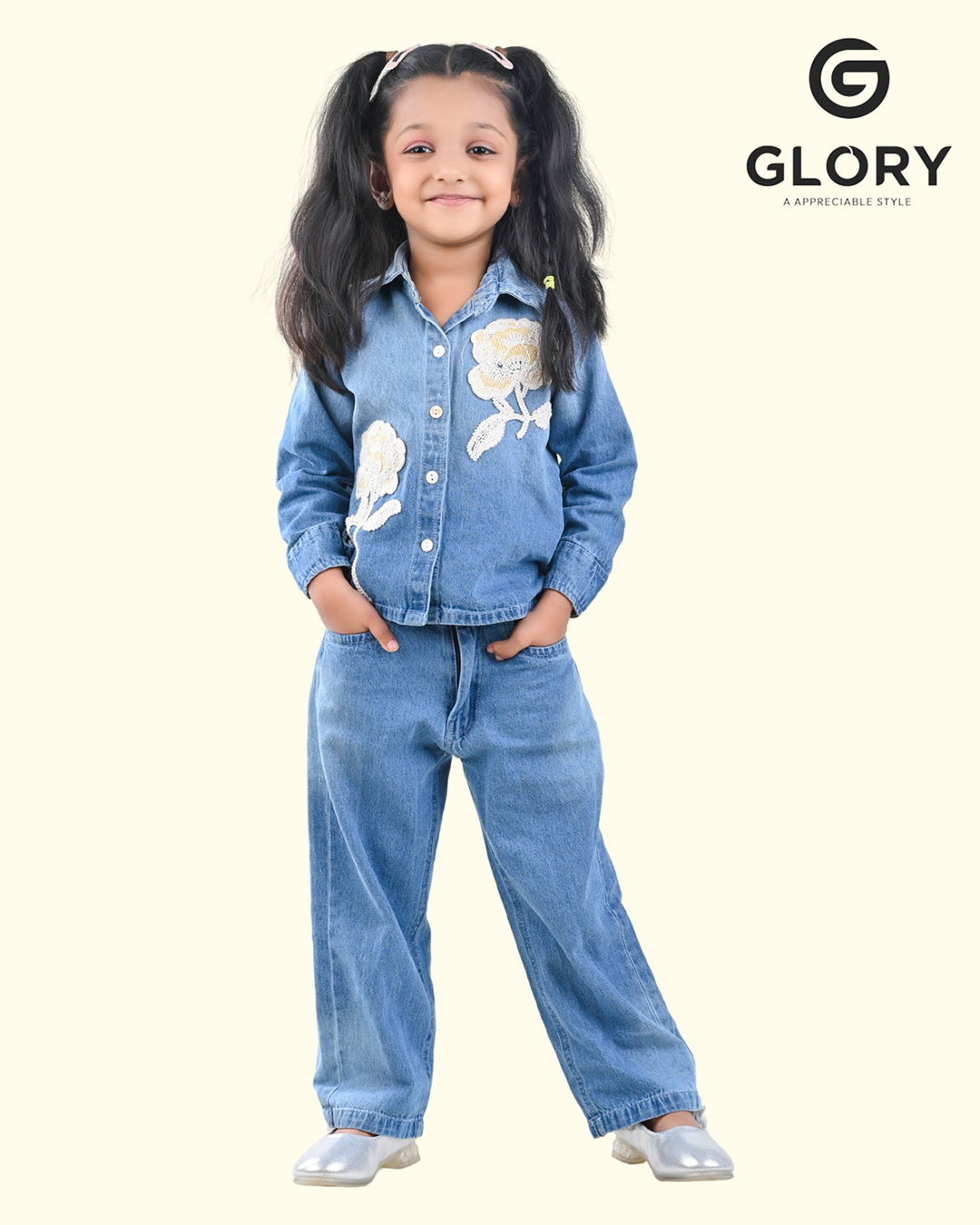 Girls Denim 2 Piece CO-Ord Set With Glittered White Rose Patches