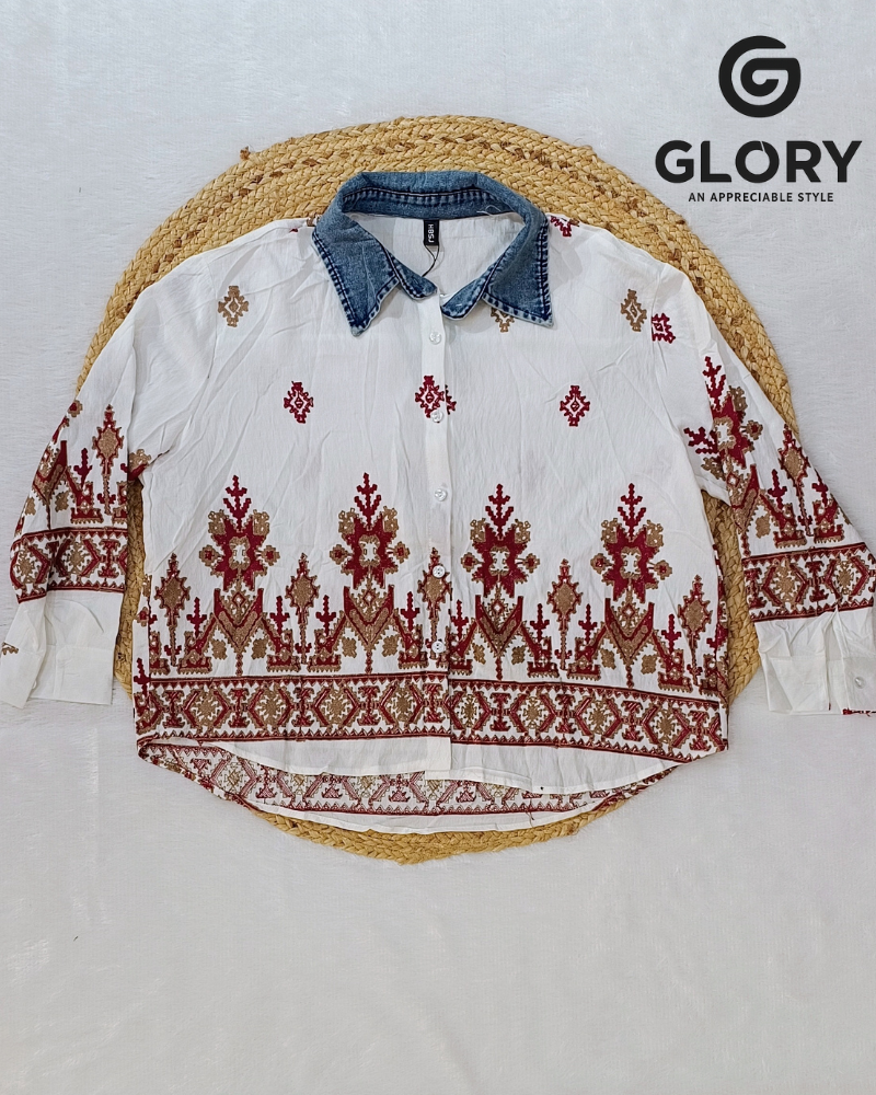 Women’s White Base Fancy Top With Thread Work & Denim Collar