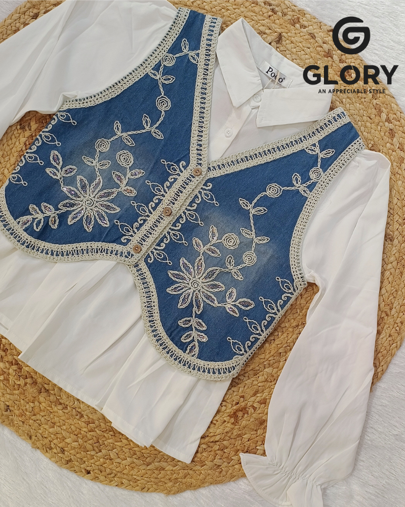 Women’s Fancy White Base Top With Detachable Denim Waistcoat