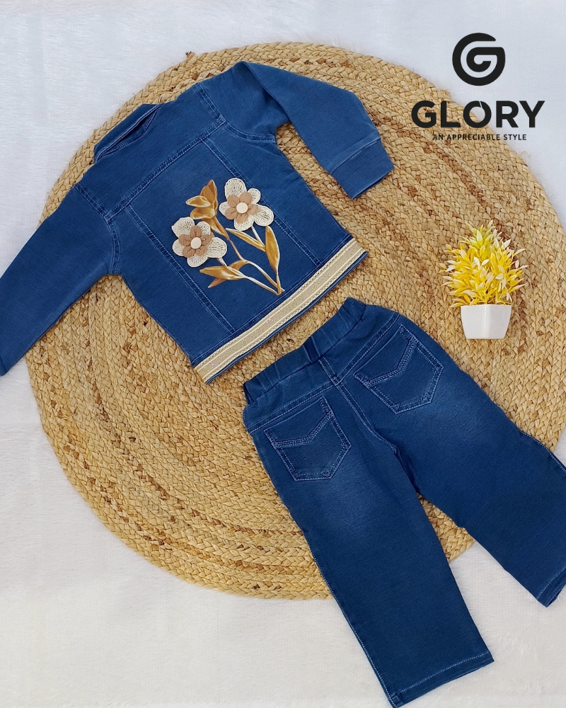 • Girls Denim Cord Set With Back Print & Floral Patches